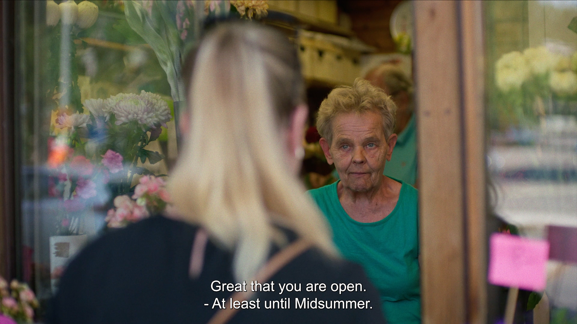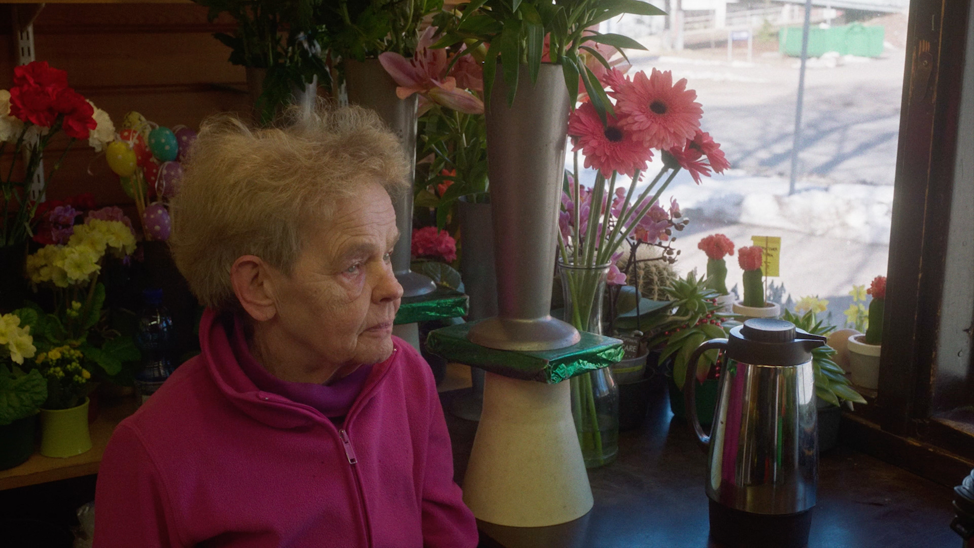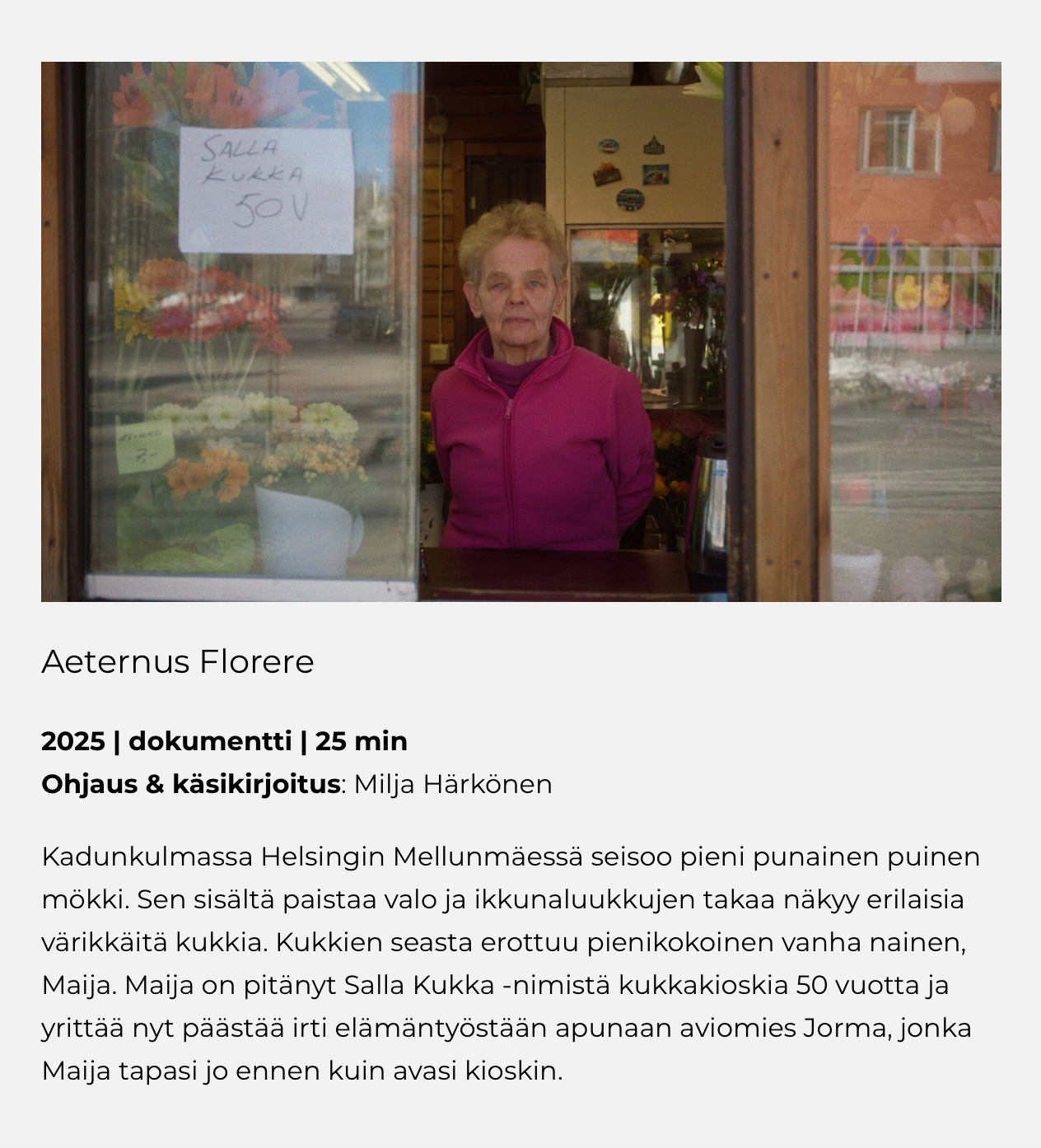 On a street corner in an East Helsinki suburb stands a small red wooden cottage. The light shines from inside and various colourful flowers can be seen behind the window shutters. A small old woman, Maija (72), stands out amongst the flowers. Maija has run the flower kiosk called Salla Kukka for fifty years and is now trying to let go of her life’s work with the help of her husband Jorma – who she met even before she opened the kiosk.